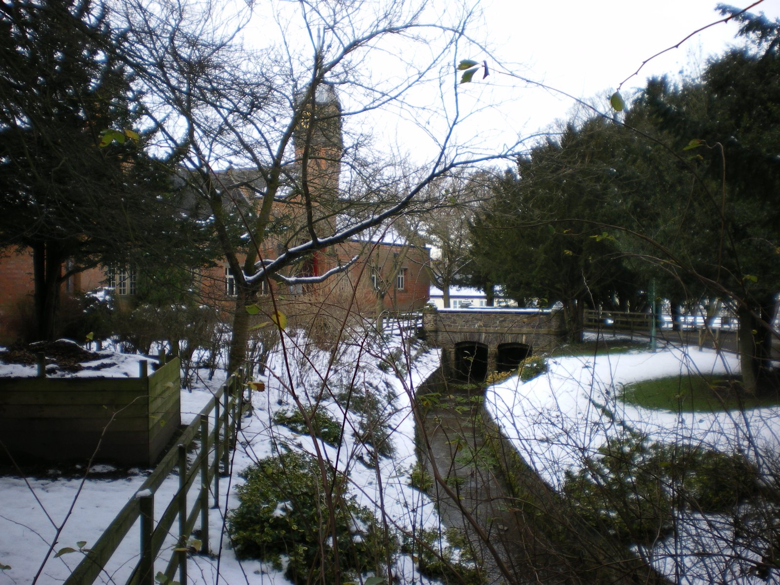 View of the exterior of Beaumanor Hall, on its east side, showing the stream and small bridge outside the stableyard, the ground among the trees covered with snow. (6 February 2009). [Photo: AD White (2009)]