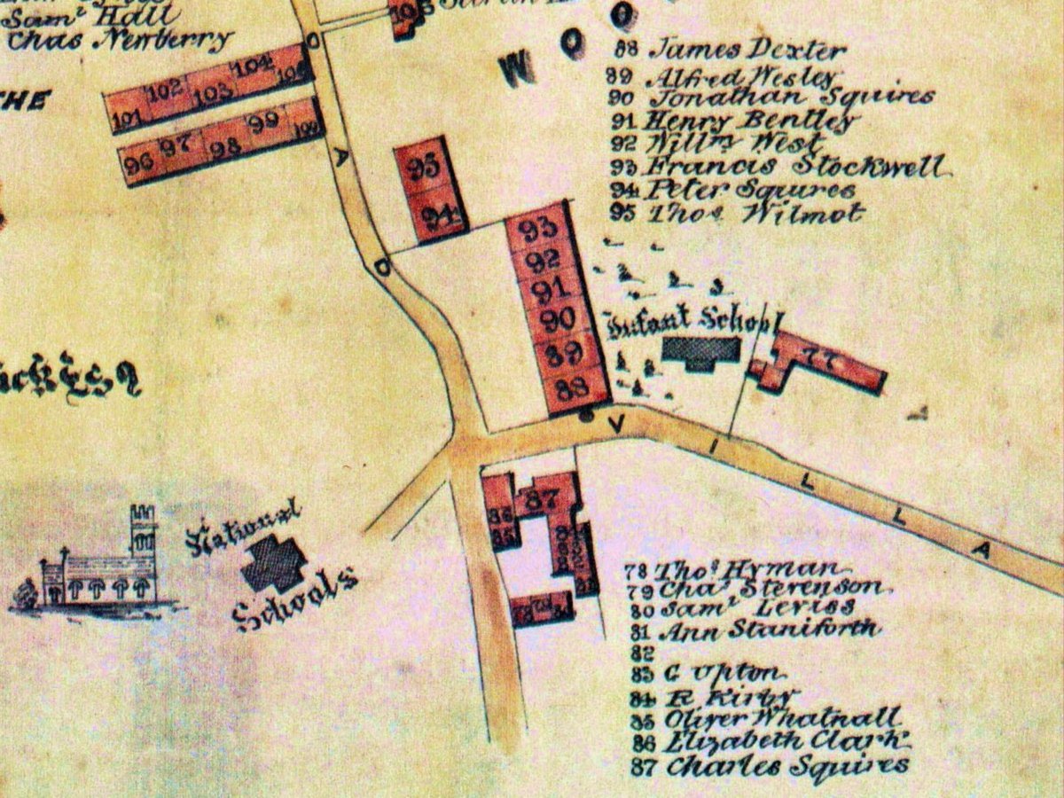 Map of the centre of the village in 1866, showing the properties owned by the Herrick family of Beaumanor Hall. Slaters Cottages are shown as Nos. 88-93 with the names of the residents.