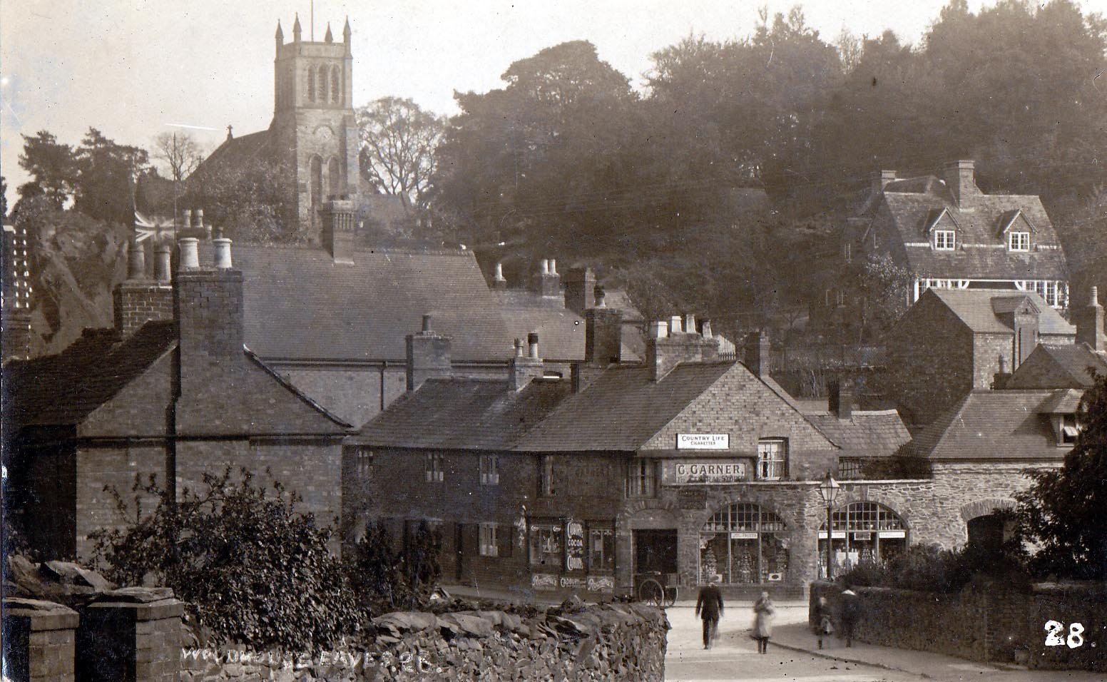 A card dated 1920 shows that the single bay window has become a double extension, probably using the original low wall as the base. A small handcart is in the entrance, delivering goods or collecting perhaps? Country Life cigarettes, Cadburys and Rowntrees are advertised. Note the Union flag flying on Church Hill.