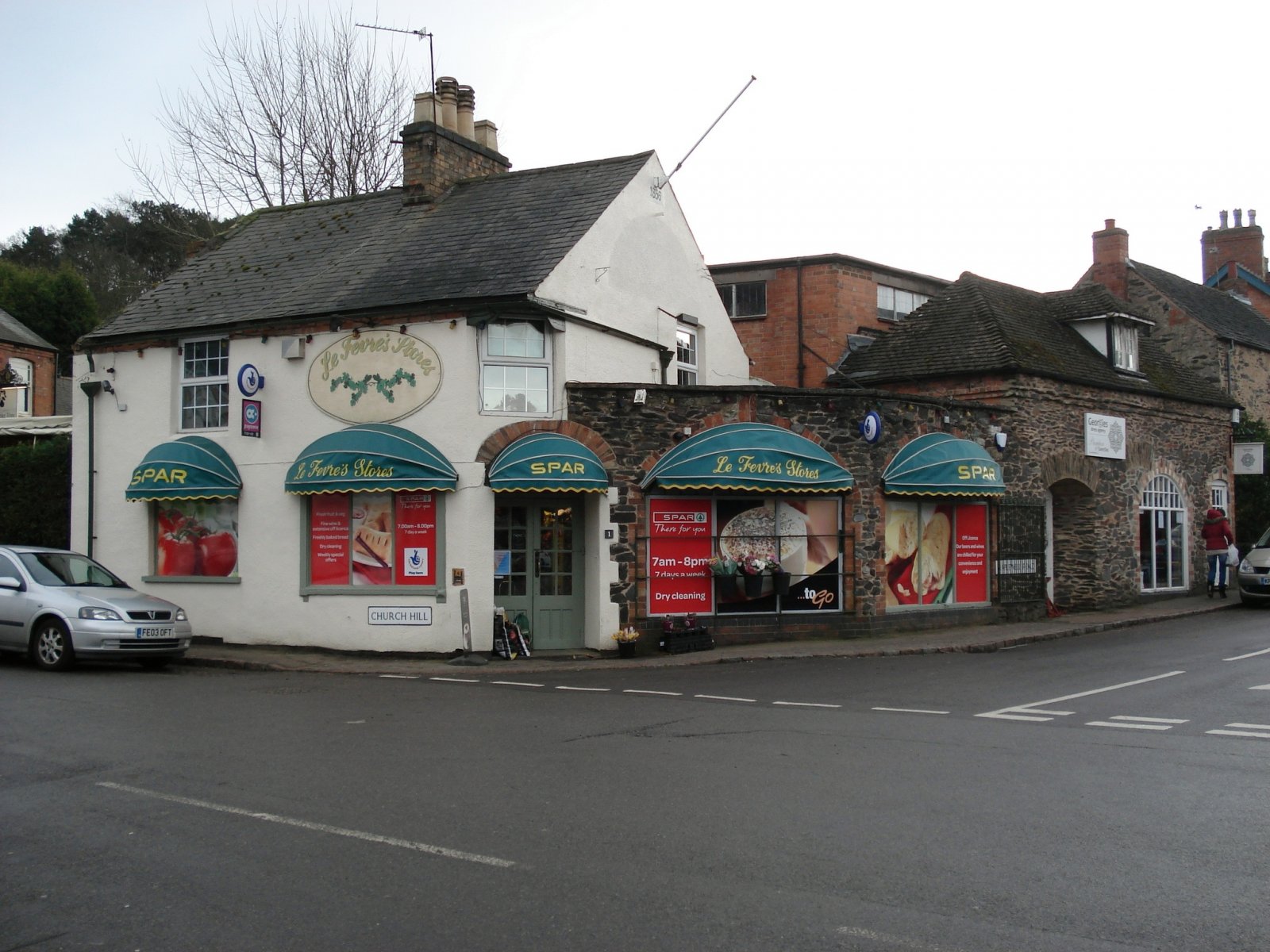 Finally, a rare view of Le Fevre's without several cars parked outside. For the benefit of our village, the shop is open every day from 7am to 8pm. The shop to the right of the stores is still owned by the North family, and is now a dress agency and beauty salon.