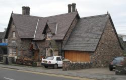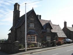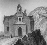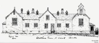 As the population increased it was necessary to extend the size of the school on Church Hill by adding a further section at each end. The sketch shows this quite clearly. The windows were diamond pattern with stone mullions. The roof had four ventilators. The very tall chimneys were necessary to control the downdraft created by the rock face behind the school. There was an entrance door at each end, and one in the original centre section. The school bell tower now faced the road.