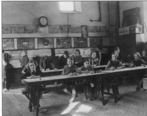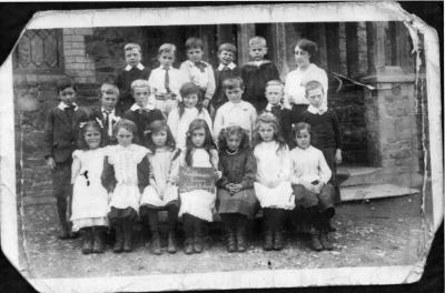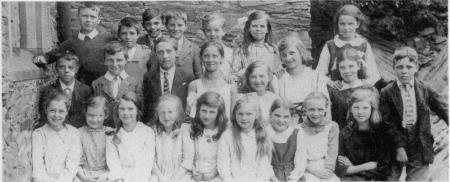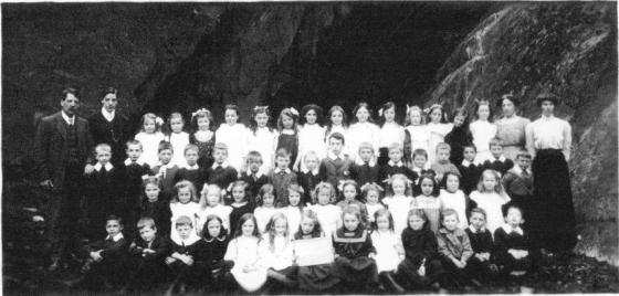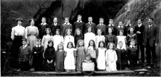 The Great War had thankfully ended, and the next photo shows the children squeezed into the narrow space between the rear of the school, and the rock face. Taken sometime in the 1920's at last the children are now looking happy.