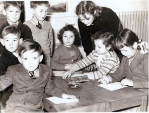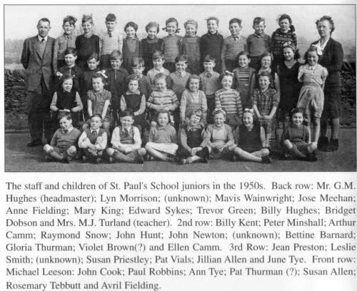 The following year, 1950, a formal photo was taken. Mr. Hughes, Headmaster is on the left, and Mrs. Turland, teacher is on the right. The names of pupils are listed, so perhaps you may recognise yourself. If so, why not send us your present photo and we may be able to add it to this page.
